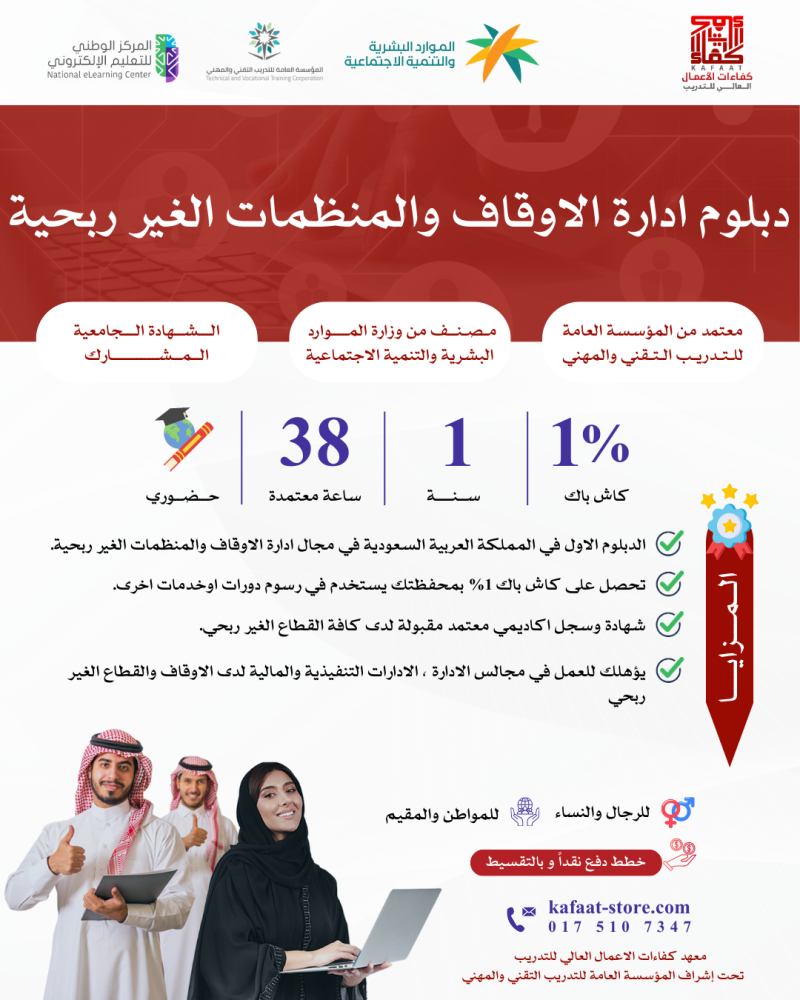 برنامج نوعي وفريد من نوعه، معتمد من المؤسسة العامة للتدريب التقني والمهني، صُمم خصيصًا لتأهيل الكوادر الوطنية للعمل باحتراف في مجال إدارة الأوقاف والمنظمات غير الربحية، بمجموع 38 ساعة معتمدة على مدى سنة واحدة ، ويعادل شهادة دبلوم مشارك من الكلية التقنية.